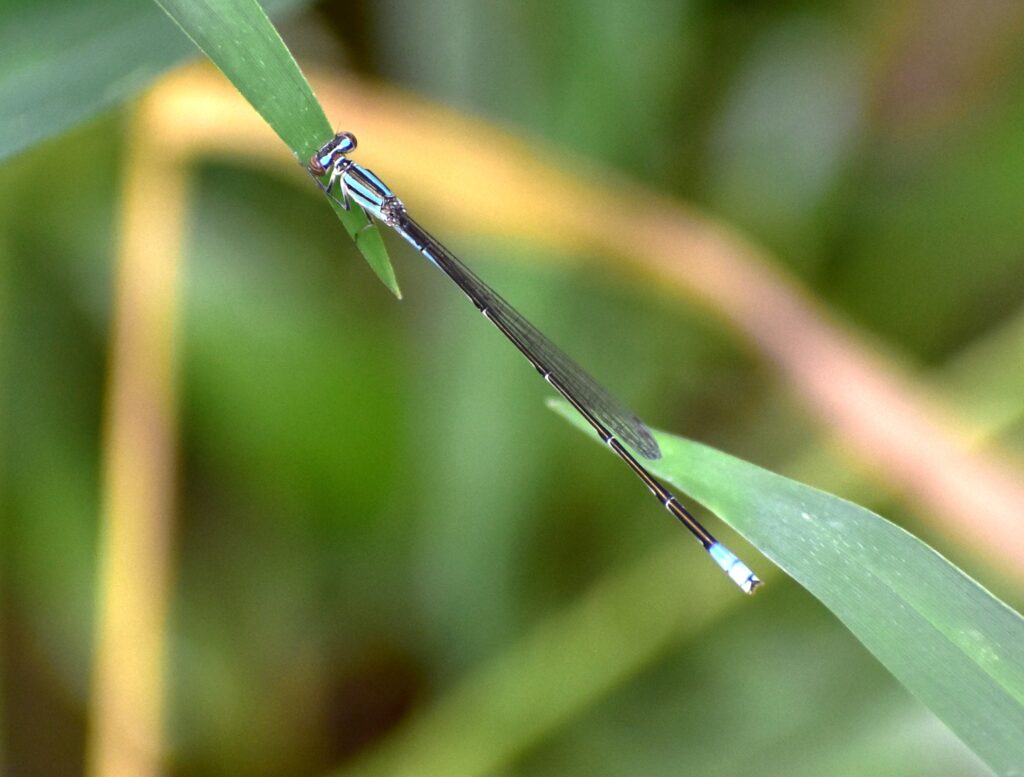 これまで初めて出会ったイトトンボを見ても、習性が分からないこともあって、なかなかイトトンボの種類を同定することができないことが多いのです。ところが、このホソミイトトンボは、頭の後ろにある白っぽい模様である眼後紋と後頭条が繋がって見えるという特徴があることで同定しやすいのです。他のイトトンボでも後頭条があるものもありますが、このように太くつながっているものは他にありません。これなら私のような素人でも同定できるのではないかと思われます。