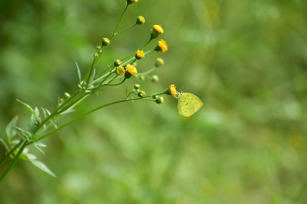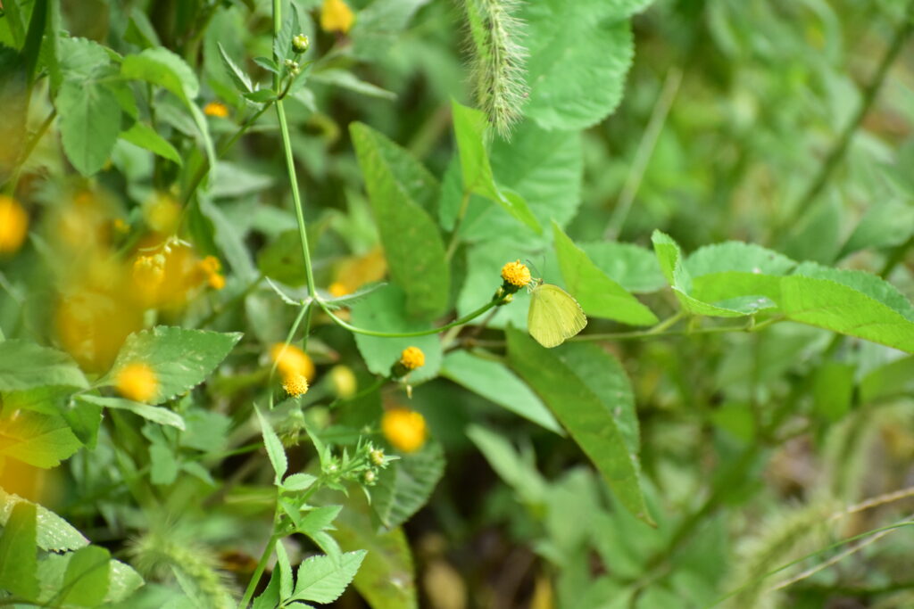キタテハ、ウラギンシジミ、ムラサキシジミなどと同じように、キタキチョウは成虫で冬を越すと言われています。冬を越すキタキチョウの多くは、10月中に成虫になっているものか、この時期に交尾して産卵・幼虫・羽化する過程を12月頃までに経たものかの可能性があります。観察していると10月の集団吸水しているキタキチョウの成虫の翅は、とても綺麗で破損しているものは余り見かけません。そのことから集団吸水する時期の直前に羽化したのではないかと思われます。ちょうどこの頃には、叢の端にコセンダングサの黄色い花が沢山咲いています。キタキチョウはその花の蜜を吸っていることが多く、コセンダングサとキタキチョウには親和性が高いと思ってしまいます。