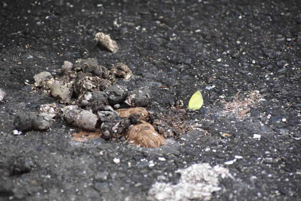 ◎左 狸の溜め糞にきたキタキチョウ 右 牛のたい肥に集まるキタキチョウ