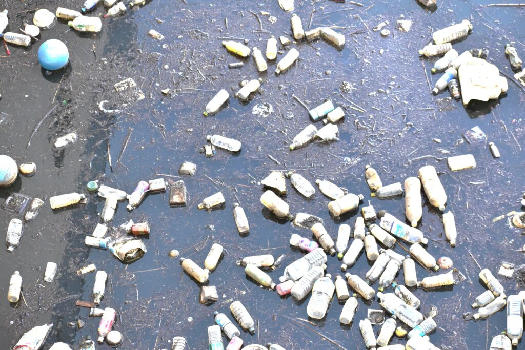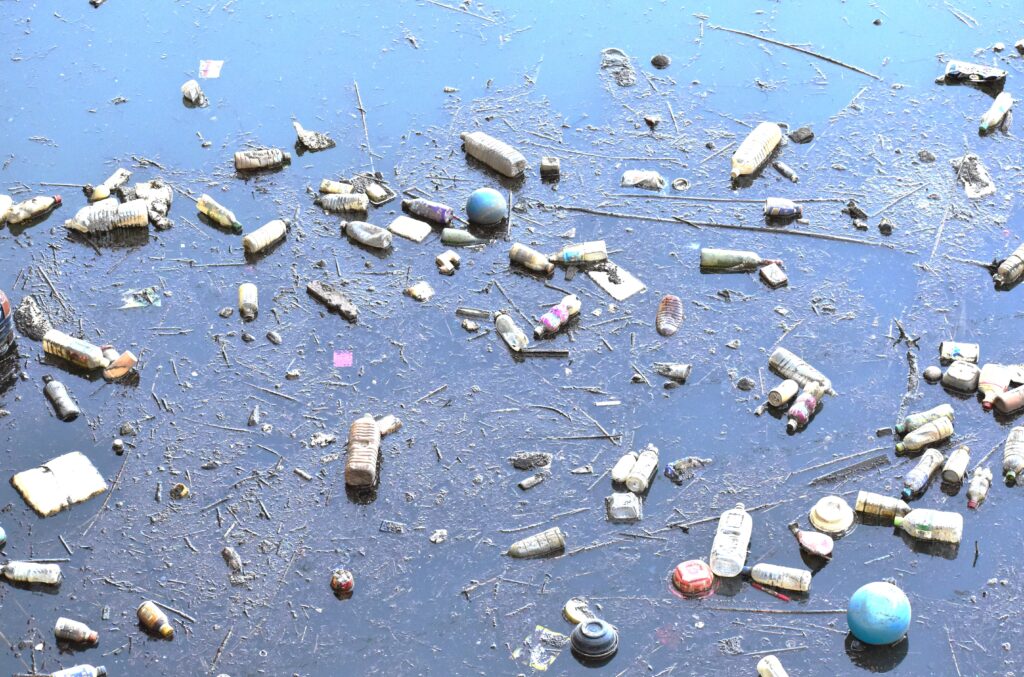 数日後、その福田川水門から南側になる日光川の土手を歩きました。この土手はいつも歩く蟹江側の土手の東の対岸になる土手で、名古屋市港区に属します。その土手の先まで行って戻ってきて、その水門上の道路から福田川の水門を見ると、沢山のペットボトルやカバンなど沢山のゴミが浮かんでいました。水門が閉じられているので、ゴミが滞留しているのです。その時刻は3時半頃でした。