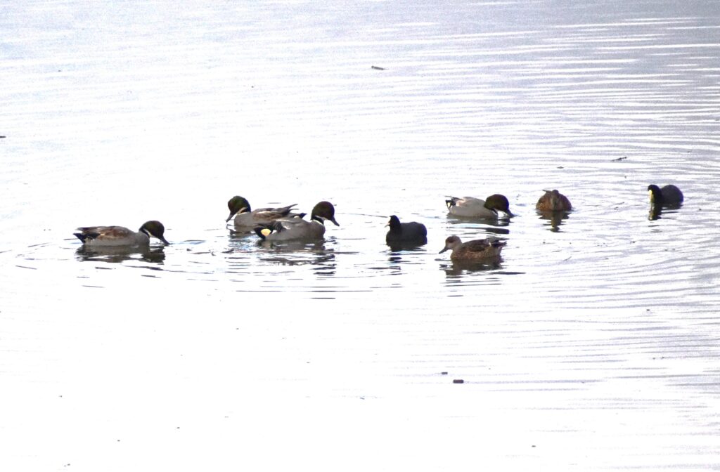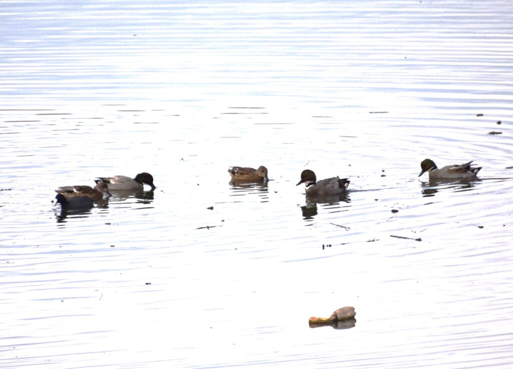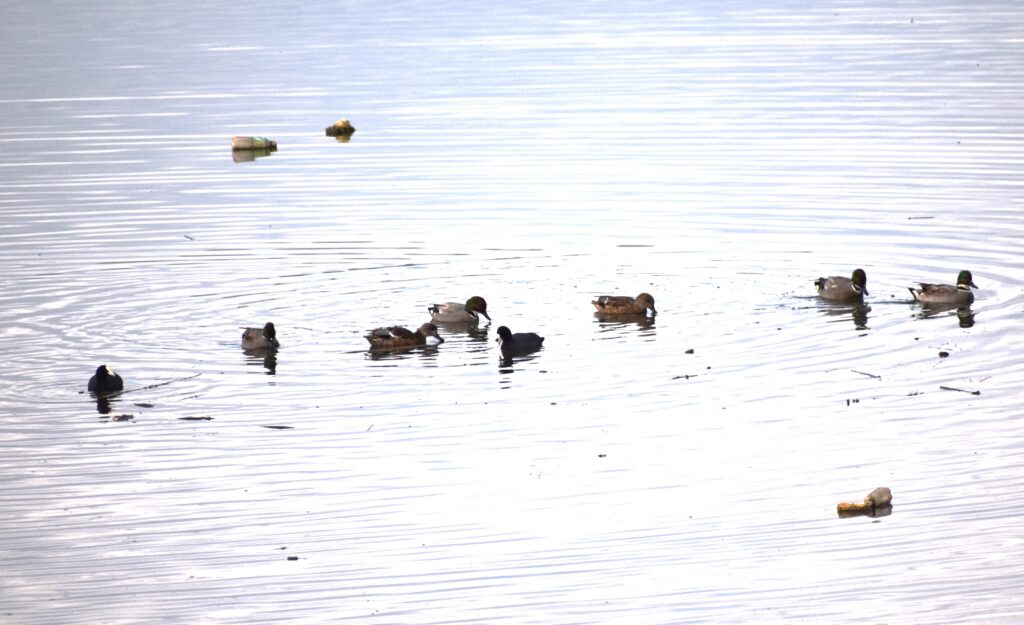 ゴミが浮かんでいる場所の少し上に当たる水面上で、ヨシガモの群れが餌を採っていました。中にオオバンも二羽混じっていました。オオバンはプラスチック袋らしいものを咥えていました。ヨシガモもその水面上で何かを採っています。